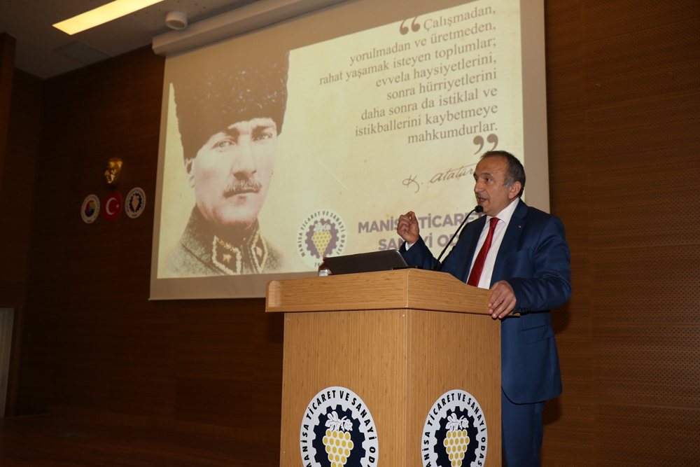 Konuşmanın ardından konferansına başlayan olan Prof. Dr. Veysel Ulusoy, ‘Türkiye Tarım Ekonomisi ve Politikaları’ konu başlığıyla gerçekleştirdiği sunumuyla, Tarım sektöründe yaşanan sorunlar ve çözüm önerileri, Türkiye’de tarımın geleceği, tarım politikaları, tarımda dijital dönüşüm ve tarımda sürdürülebilir olmanın formülünün ne olduğu, tarımda katma değer yaratma ve markalaşmada nasıl bir yol alınması gerektiğine dair görüşlerini Manisa iş dünyasının temsilcileri ve davetlilerle paylaştı. Yaklaşık iki saat süren konferansın son bölümünde ise Prof.Dr. Veysel Ulusoy, katılımcılardan gelen soruları cevaplandırdı.