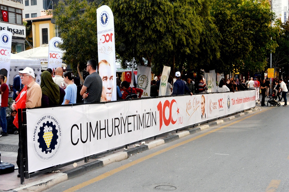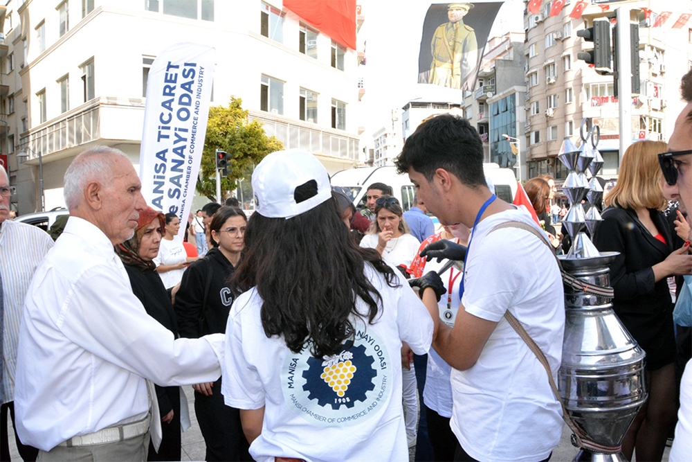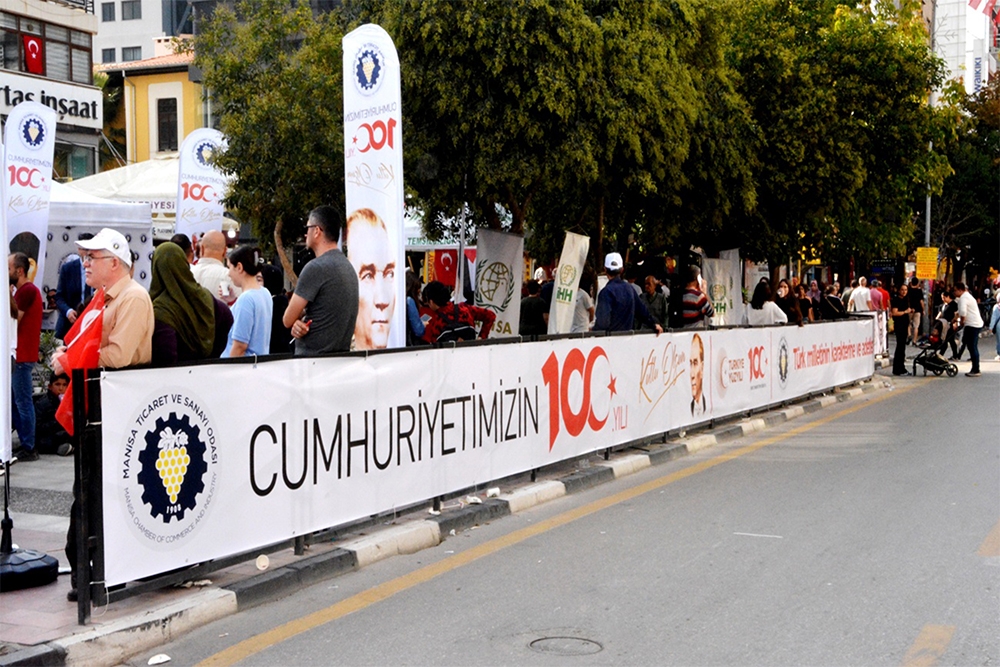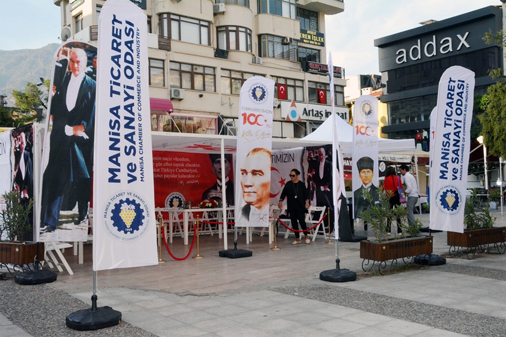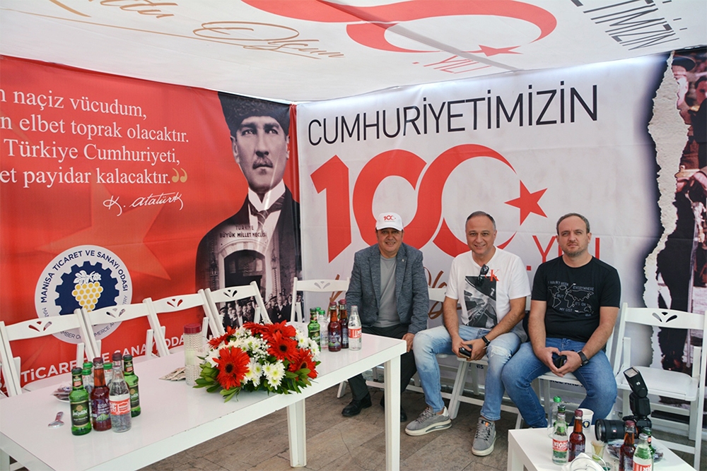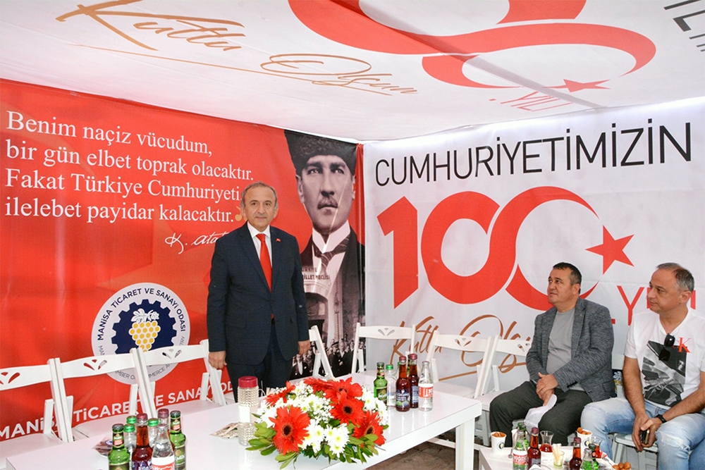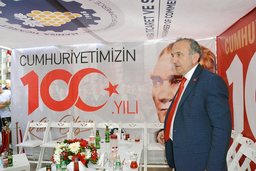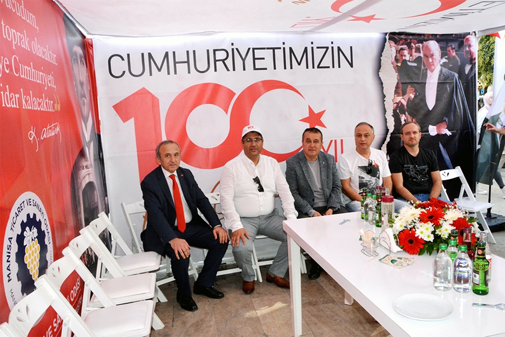 Odamız Türkiye Cumhuriyet’inin 100. Yılını büyük bir coşkuyla kutladı. Manisa TSO, 15 Temmuz Demokrasi Meydanı’nı afişlerle donattı, stant açtı. Manisa Valiliği önünde düzenlenen kutlama töreninde vatandaşlara Türk bayrağı, balon ve şapka dağıttı. Tören bittikten sonra Manolya Meydanı karşısındaki alanda 10 bin adet Türk bayrağı, 10’ar bin adet Türk bayrağı, şapka, 10 bin paket kuru üzüm, şıra dağıttı. Ulu Önder Gazi Mustafa Kemal Atatürk, silah arkadaşları ve aziz şehitler anısına lokma hayrı gerçekleşti. Yunusemre Belediye Başkanı Dr. Mehmet Çerçi de standı ziyaret etti.