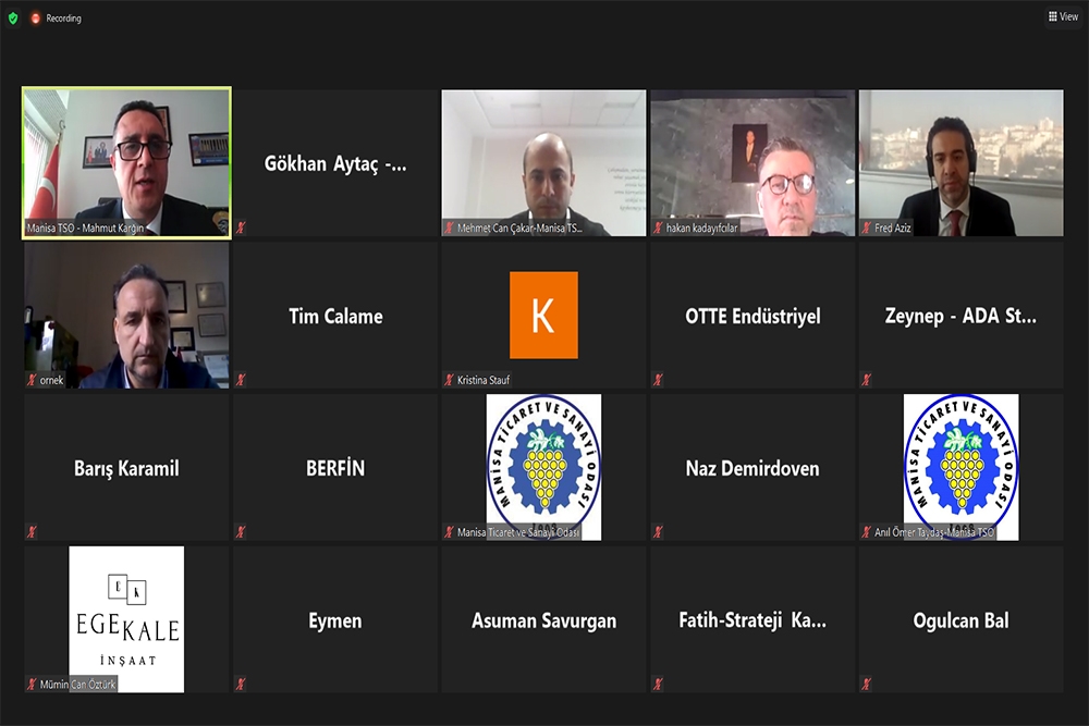 Pandemi koşulları sebebiyle Zoom Çevrimiçi Platformu üzerinden ve TOBB Manisa İl Oda ve Borsalar Akademik Danışmanı Prof. Dr. Mahmut Karğın'ın moderatörlüğünde gerçekleşen toplantıya Manisa TSO Yönetim Kurulu Üyesi Hakan Kadayıfçılar, ABD Büyükelçiliği Ticaret Ataşesi Eli Lovely, ABD Ticaret Müsteşarlığı, Ticaret Ataşe Yardımcısı Naz Demirdoven, ABD Kalkınma Ajansı uzmanları, Manisa Ticaret ve Sanayi Odası Meclis üyeleri, Manisa İş Dünyasının seçkin temsilcileri, Proje ve İş geliştirme Koordinatörü Mehmet Can Çakar katılım sağladı.